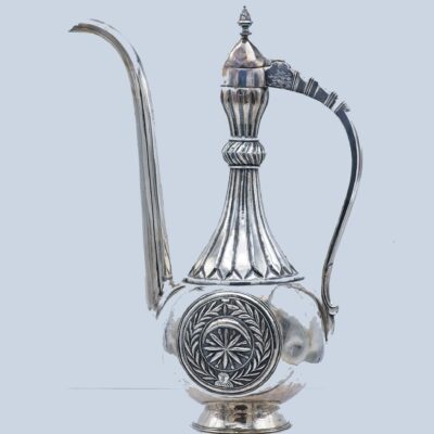 A water ewer, is a metal container with a spout used for pouring water during the bathing process. Ewers were often crafted from brass, copper, or silver and could be engraved with floral motifs or geometric designs.
