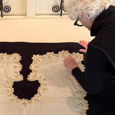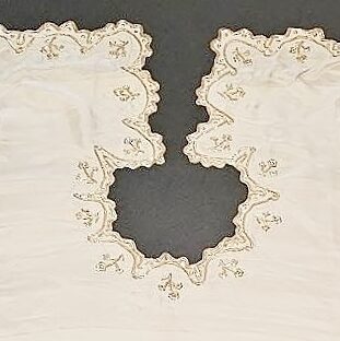 (67) Buqcha, (Private Collection- Nadia Tobia) Iraq, Mosul, 20th century 1914, silk and silver gilt thread). The arabic text translates to “Happy Marriage Ibrahim” Ibrahim Akrawi is Aysar Akrawi uncle and Nadia Tobia grandfather.