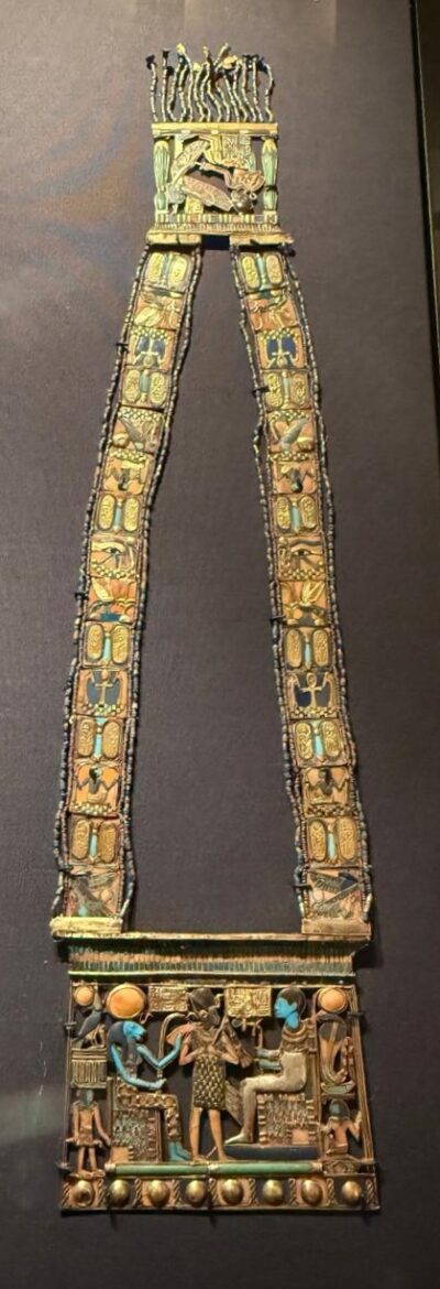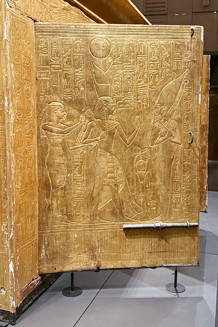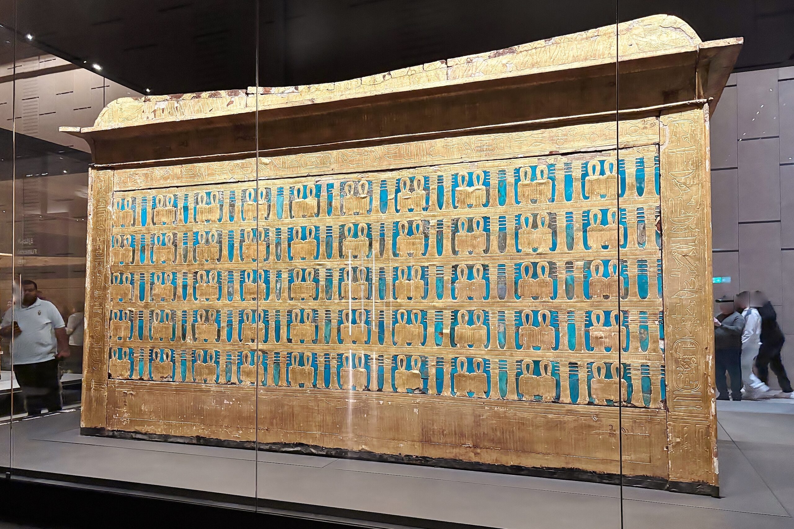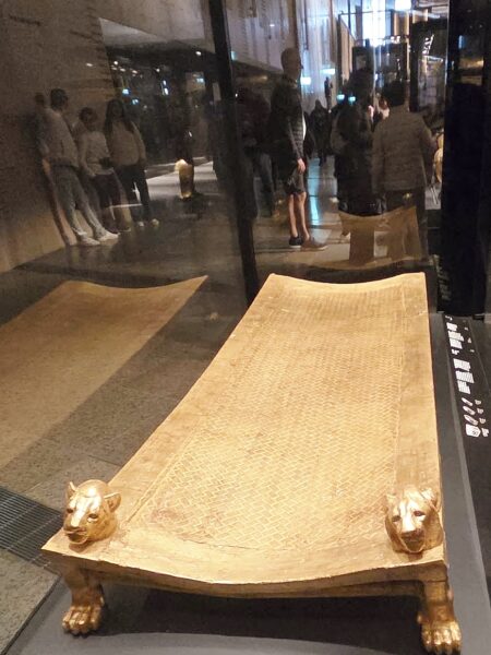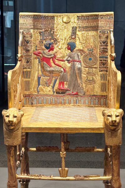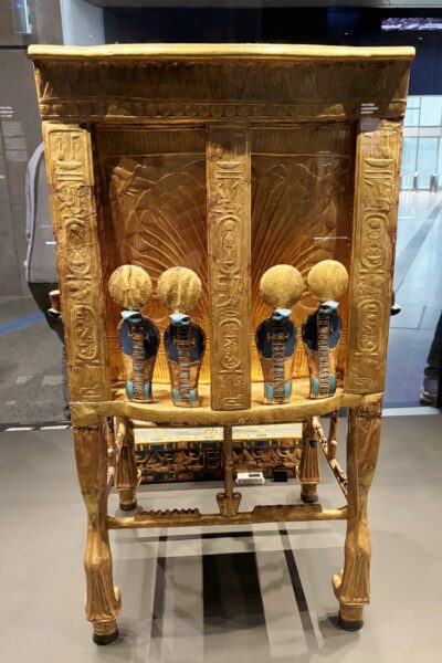 Another extraordinary piece is Tutankhamun’s golden throne, decorated with scenes of the king and his queen, Ankhesenamun. The throne features delicate inlays of colored glass and precious stones and provides insight into royal life and artistic style during the Amarna period.