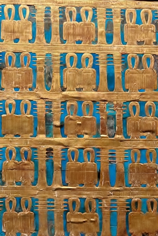 The main panel on the front of the backrest is a masterpiece of craftsmanship. The scene features  the royal couple: King Tutankhamun and his wife, Ankhesenamun, the daughter of Queen Nefertiti. Originally named Ankhesenaaten, she changed her name to Ankheseamun when the kingdom returned to its traditional religion, worshiping the God Amun.