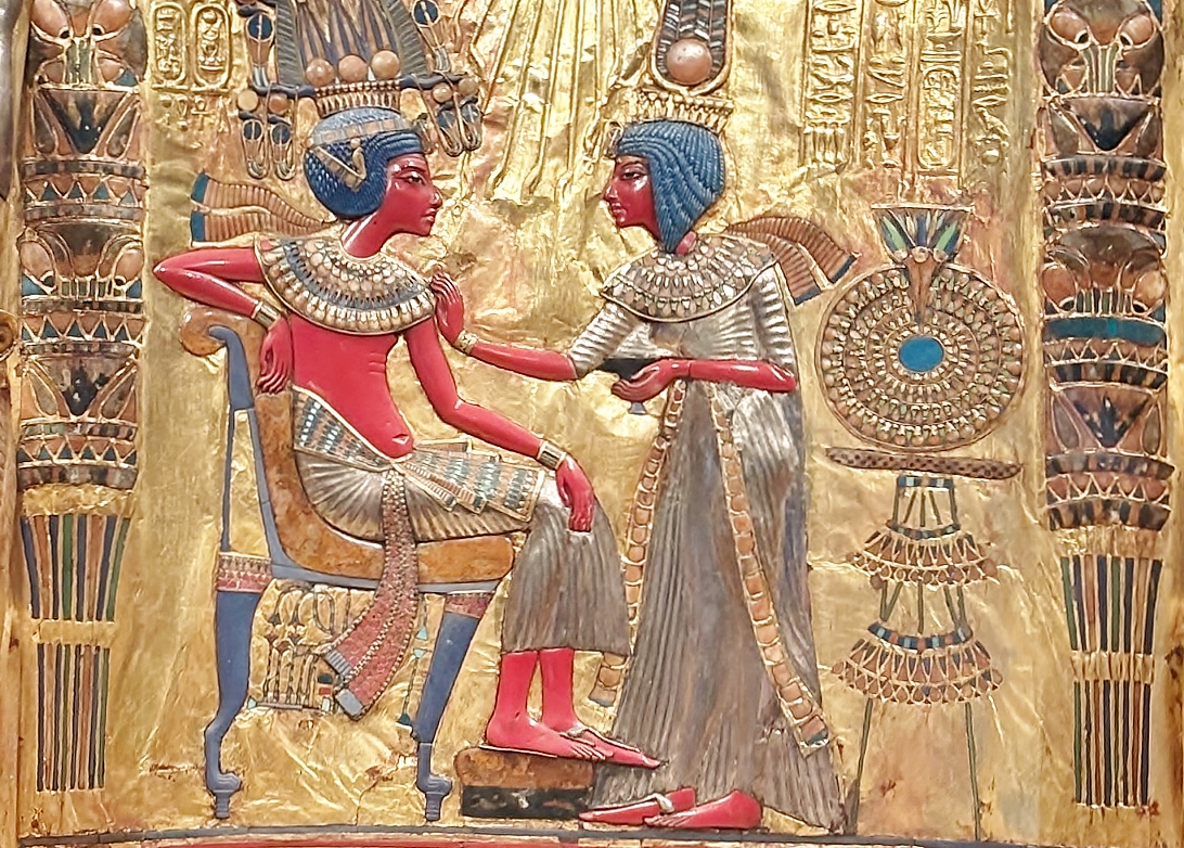 The queen is shown pouring perfume over the king’s shoulder. Both figures wear only one thong sandal, Tutankhamun on his left foot and Ankhesenamun on her right. This detail is often interpreted as a symbol of their equality as partners or as a representation of marriage.