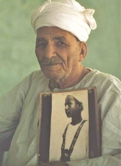 Fig 2 Hussain Abdul Rasoul, with his image as a young boy at the time of the tomb discovery, he is pictured wearing one of Tutankhamoun necklaces. Source of image: Egyptian Museum in Tahrir Square.