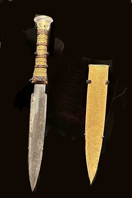 A model of King Tutankhamun’s mummy was created to display the gold wrappings and the golden mask. More than 110 ornaments were found on the body, in addition to the crook and flail—symbols of royalty—the scarab symbolizing eternity, good luck, and resurrection, and two daggers belonging to the king, one made of solid gold and the other of iron.